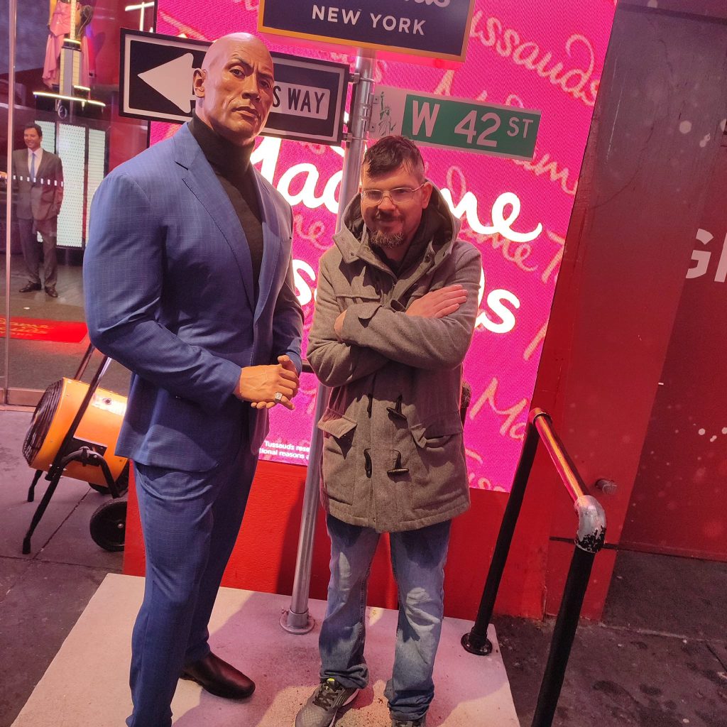 Times Square was exciting – bright lights and entertainment everywhere. Unfortunately, we never saw the Naked Cowboy! I did get a photo with The Rock though 😉 I had got a mohawk haircut for this trip but didn’t even bother trying to spike it because of the weather.